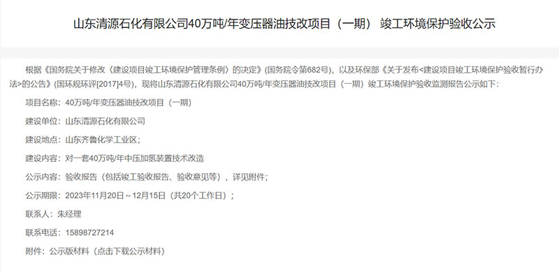 山東清源石化有限公司40萬噸/年變壓器油技改項目(一期) 竣工環(huán)境保護驗收公示